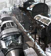 І опускаємо крайній правий зелений важіль справа (там їх три: жовтий, червоний та зелений), а жовтий та рожевий піднімаємо. Запалюємо зелену лампу внизу справа тумблером поруч із нею. У вікні справа з'явилися цифри "03". Повторюємо описані маніпуляції, тільки важіль лампи А опускаємо, а лампи піднімаємо. Коли запалюємо зелену лампочку "В", опускаємо крайній лівий важіль направо (жовтий), а два інші важелі піднімаємо (червоний та зелений). З'явилися цифри "28". Поєднавши, отримуємо радіочастоту пілота – "0328". Ідемо в радарну вежу, включаємо червоним важелем радіо (нагорі), вводимо номер частоти (0328) за допомогою червоних кнопок у два ряди, натискаємо кнопку на мікрофоні та говоримо з Борисом через мікрофон. Виходимо з радарної вежі, йдемо до Бориса та говоримо з ним. Він біля кабіни літака. З'ясовується, що до поїзда нам потрапити лише на катапульті з літака. Сідаємо в крісло пілота і вводимо будь-який кут зліва і натискаємо кнопку катапультування (нижче). Виходимо та йдемо до радарної вежі. Включаємо радар. З'ясовується, що антену радара повернуто не в той бік. Виходимо зовні і залазимо нагору до антени. Повертаємо її на схід (позиція "В"). Повертаємось у радарну вежу та обчислюємо положення поїзда за шкалою на краю монітора (кнопка вмикання знаходиться у правому нижньому кутку приладу). Координати поїзда 80 (82) по вертикалі та 20 (17) по горизонталі. Повертаємось до літака, сідаємо біля крісло пілота, вводимо координати та натискаємо на кнопку нижче.