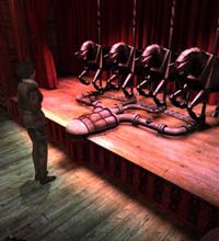 Проходимо прямо. Праворуч на сцені бачимо чотирьох механічних коней, а перед нами Ізя Цукерман. Говоримо з ним. Потім підходимо до коней та розглядаємо їх. Повертаємося до Цукермана і знову говоримо з ним. Він попросить запросити Ганса на ремонт механічних коней. Виходимо з кабаре і йдемо праворуч, потім повз афіш до ворот з віконцем і дзвінком. Дзвонимо. До віконця підійде Іван (один із братів Бургових). Говоримо з ним. Ідемо далі вздовж паркану до останнього плаката (афіша з кіньми), відклеюємо його (ліворуч нагорі) і залазимо у двір до Бургових. У дворі оглядаємо скриньку (у центрі двору). Там знаходиться якась тварина. Це Юкі (youki). Випускаємо його з ящика, відімкнувши засув. Іван втече ловити Юки, а ми йдемо до грубки. Зрозуміло, куди поділася солярка з машини для подачі вугілля. Ідемо під навіс. Там спить другий брат Бургов. Виходимо з-під навісу і зліва бачимо таку ж червону каністру, як у нас, тільки повну. Змінюємо нашу порожню каністру для солярки на повну каністру Бургових. Ідемо з двору Бургових (тим же шляхом, що й прийшли) і йдемо ліворуч, проходимо паркан і підходимо до мосту. Звертаємо увагу на ящик праворуч і переходимо через міст. Попереду монастир, але далі ми пройти не можемо, бо ми одягнені легко. Повертаємось до основи машини для подачі вугілля. Заливаємо пальне і запускаємо двигун, натиснувши червону кнопку на стовпі. Говоримо з Малькою і піднімаємося нагору. Ідемо до дозатора вугілля, смикаємо за важіль. Вугілля ми запаслися. Приходить Оскар і каже, що зник Ганс. Вирушаємо на пошуки Ганса.