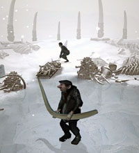 Повертаємось на ковчег, спускаємось у трюм, йдемо в далеку кімнату і розглядаємо картинки на стіні. Зліва на них намальовані фігури, а праворуч зображені комбінації з кількох крапок. Звертаємо увагу на картинку з мамонтом. Використовуємо квітку на ніс Юкі, будимо її і разом із нею йдемо до воріт, де нас уже чекає Ганс. Натискаємо важіль (внизу, ліворуч від барабана) та Юкі допомагає нам. Ідемо нагору на оглядовий майданчик (праворуч) і говоримо з Гансом. Знаходимо п'яту кам'яну плитку з ієрогліфом поруч із п'єдесталом і маємо всі п'ять плиток як на внутрішньому колі амулету. Повертаємо колесо в центрі, пляшка з піском перевертається, і ми беремо ключ зі слонової кістки. При цьому помічаємо, що зі глека сипеться пісок на ту саму плитку (це підказка для наступної загадки). Ідемо на сусідній бік оглядового майданчика. Вставляємо ключ зі слонової кістки у відповідний отвір. Кришка відкрилася і видно ієрогліфи. Шукаємо на амулеті ієрогліф, на який сипався пісок, і дивимося, що відповідає йому на зовнішній стороні. Виймаємо ключ із слонової кістки і вставляємо його у другий зліва отвір у нижньому ряду. Обертаємо колесо. Звертаємо увагу на шість отворів зліва внизу. Згадуємо картинку із ковчега. Закриваємо середній отвір у нижньому ряду (натискаємо двічі), прикриваємо на половину середній отвір у верхньому ряду (один натиск) і прикриваємо на половину лівий нижній отвір (один натиск). Інші отвори залишаємо відкритими. Смикаємо за здвоєний важіль праворуч. До нас виходять мамонти та відвозять Ганса.